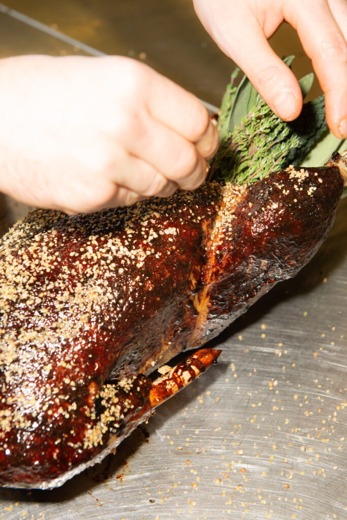Knuspriger Weidegans-Braten glaciert in Gänsejus & Zitruspulver, dunkle Mole, Ancho Chili Karotten & Kartoffel Tamales